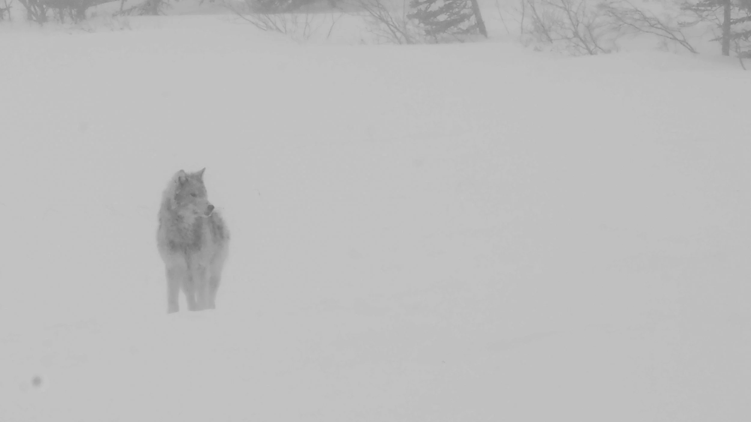 A lone wolf scans the horizon the blowing snow makes it difficult to see the path forward.